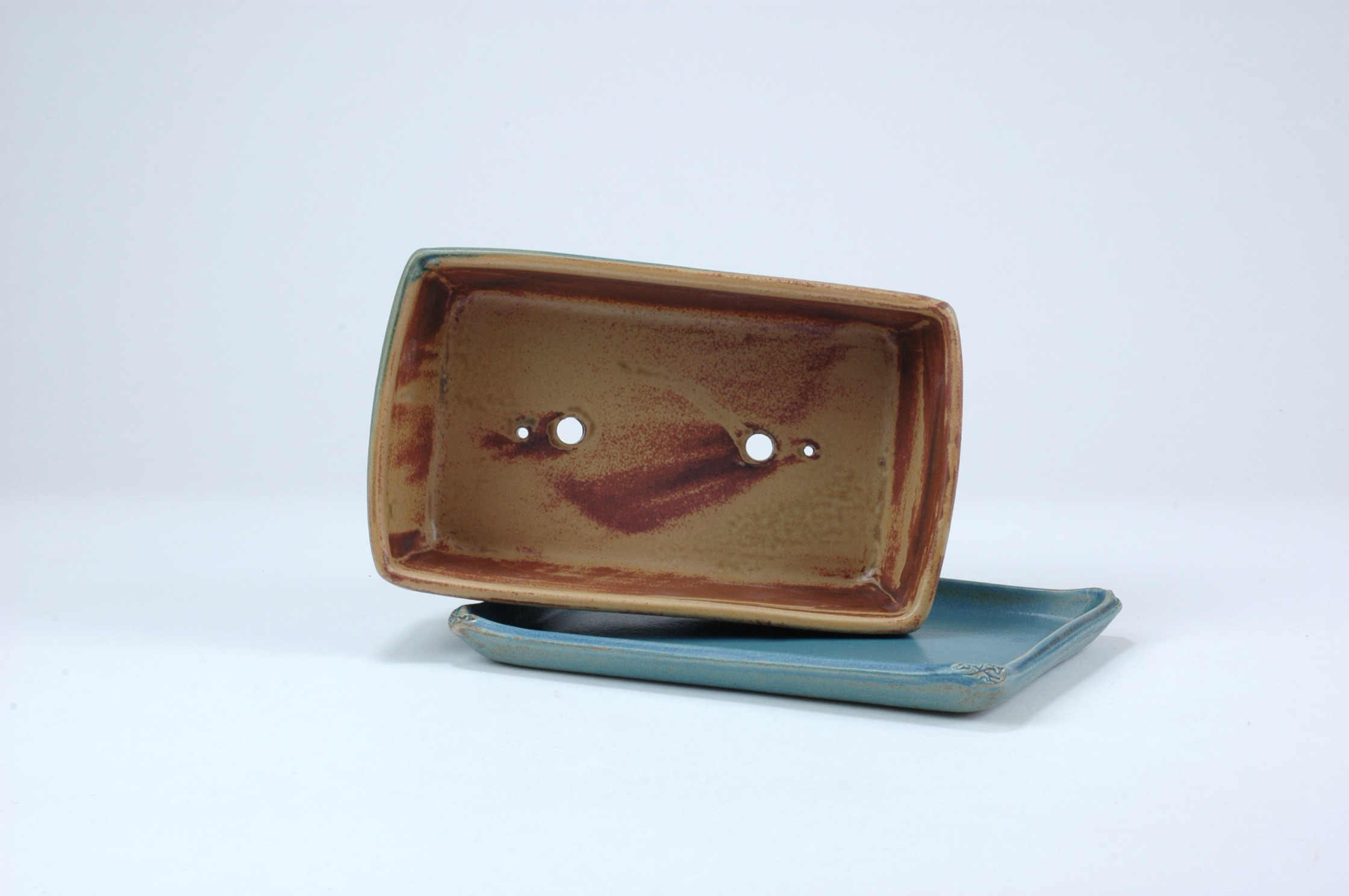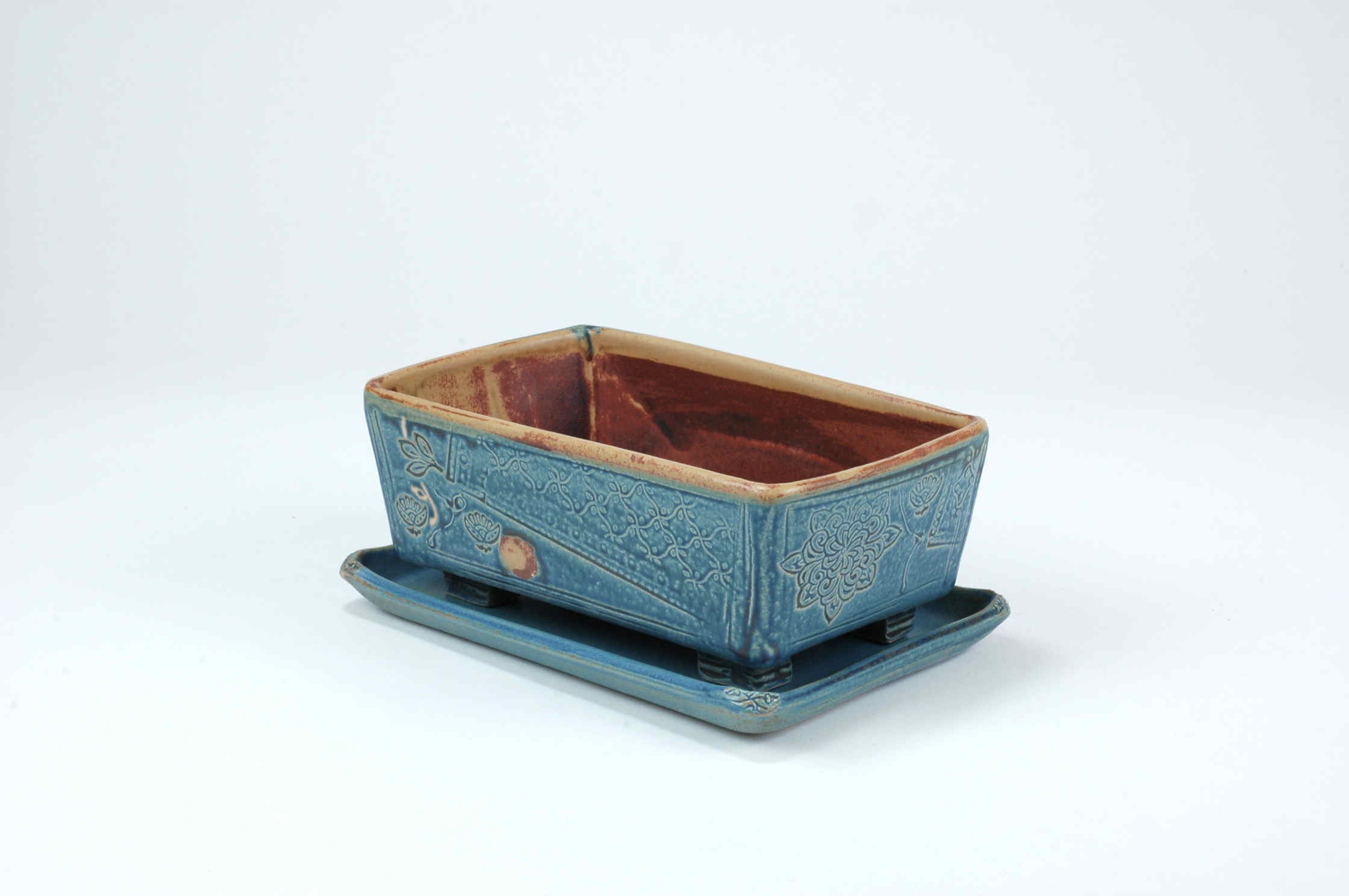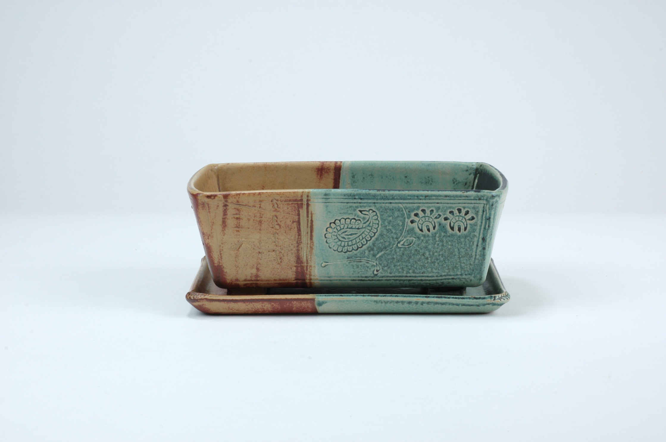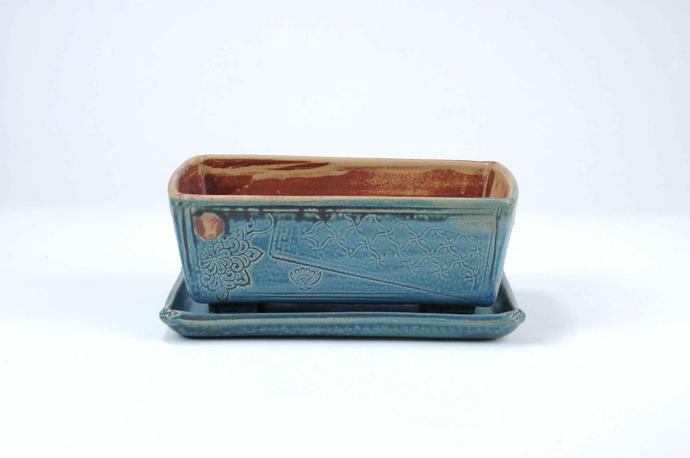Eine kleiner rechteckiger Pflanzkasten mit Abzugslöchern im Boden. Er steht mit kleinen angarnierten Füßchen auf einem dazu passenden rechteckigen Teller. Der Teller kann das Wasser aufnehmen wenn zuviel gegossen wird. Die niedrige Höhe der Pflanzschale ist besonders geeignet um einer Bonsaipflanze einen passenden Topf zu geben. Auch für Sukkulenten mit ihrem geringen Wurzelwerk ist die Bonsaischale gut geeignet. Mehrere verschiedene Sukkulentenarten können darin hübsch zusammengestellt werden.