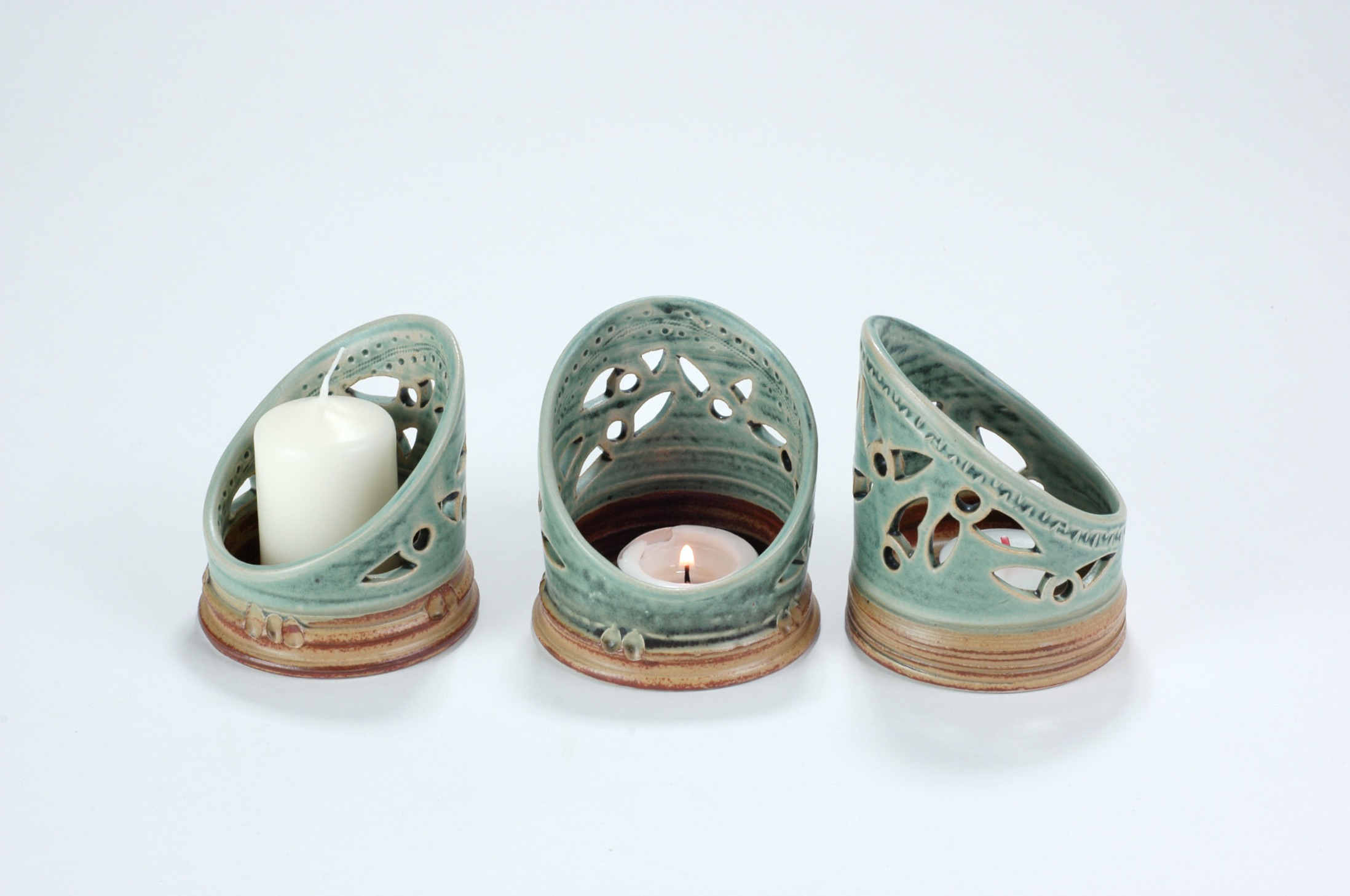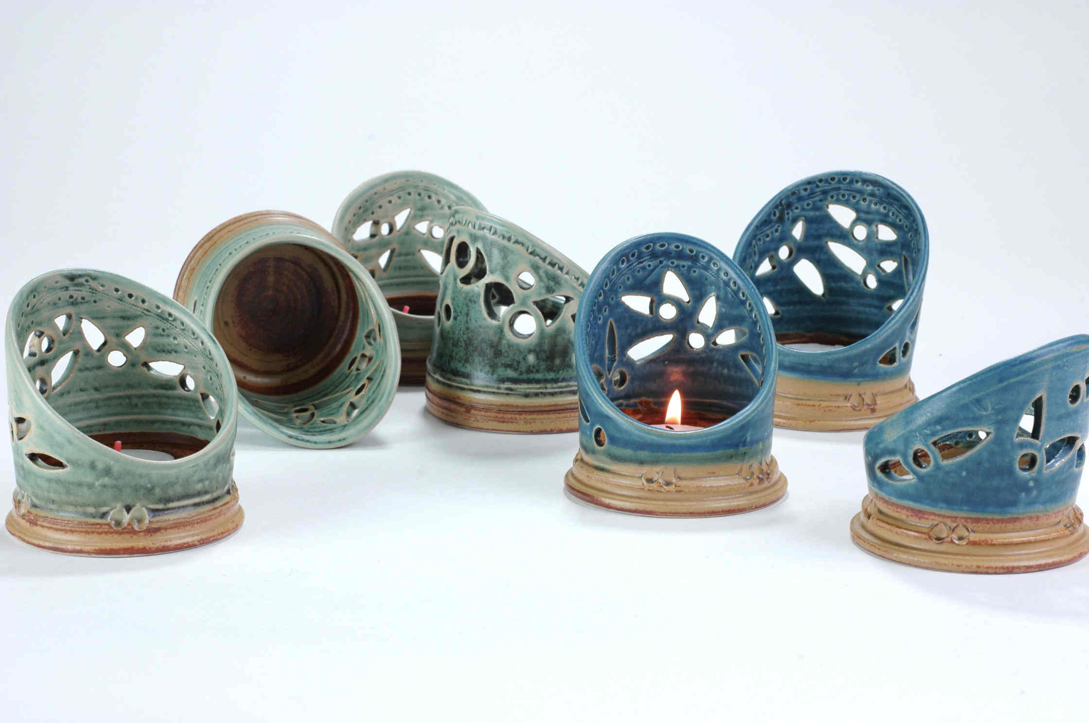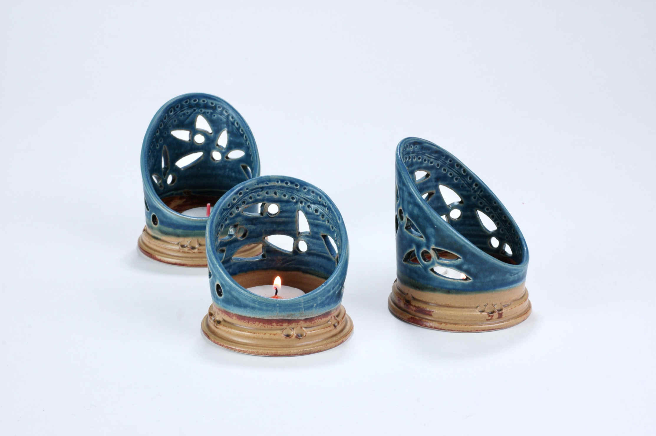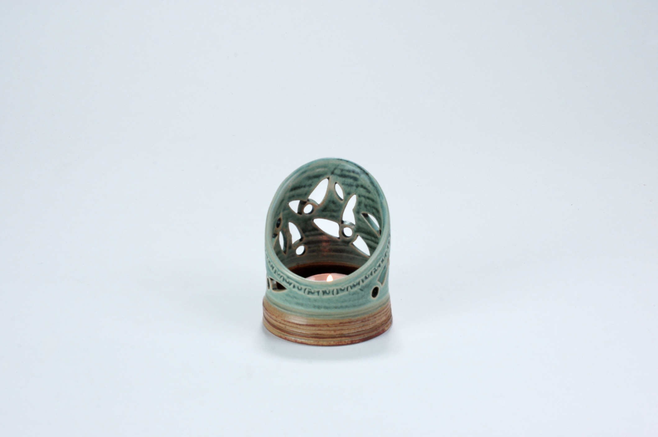 Ein kleines Traumlicht für ein Teelicht oder eine schmale Kerze. Der Teelichthalter ist in der Höhe abgeschrägt, je nachdem von welcher Seite man schaut sieht man mehr in die Flamme oder das Licht, das durch die Ausschnitte leuchtet. Das Lichtgefäß hat eine breite Standfläche, ist außen oder innen durch eine Linien- Prägung dekoriert und hat ganz unterschiedliche Ausschnitte. Das Windlicht ist unten und am inneren Boden rost-sanbdfarben und oben entweder blau oder grün.